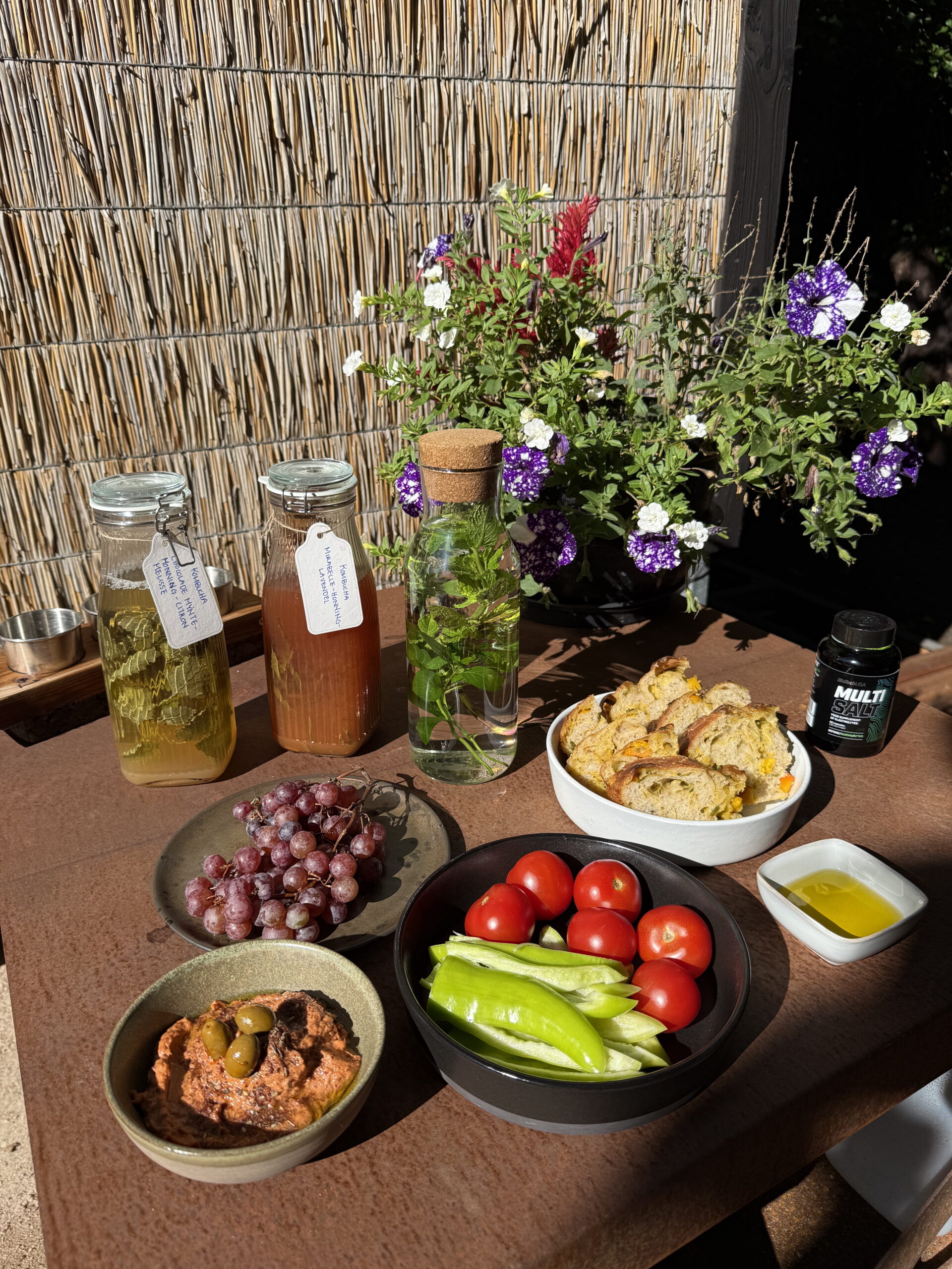 Mellem runderne køler du ned i vores koldvandskar, under udebruseren og mærker frisk luft mod huden – og vi sørger altid for vand, fermenterede drikke og sunde snacks til pauserne, så du kan genoplade og nyde øjeblikket.